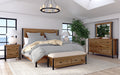 The Industrial Modern style of the Norcross Bedroom group blends the natural beauty of its rustic veneer with its clean lines and abundant metal accents throughout. This bedroom collection features custom designed wood and metal hardware and is finished in a warm and inviting hickory finish.
