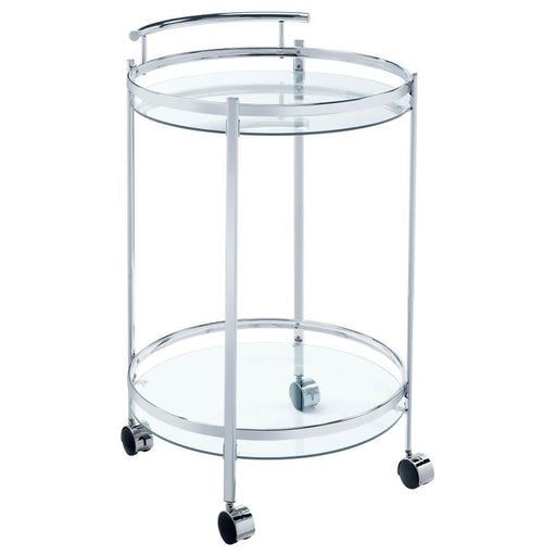 View full detailsChrissy - serving cart Chrissy - Round Glass Shelf Metal Bar Cart - Chrome20.75"W x 20.75"D x 31.0"H - 15.25 lb