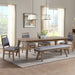 The Oslo Dining Collection is constructed with wire brushed oak veneer and offered in a Weathered Chestnut finish. Unique features of this collection are the patterned veneer table and sideboard tops, woven bonded leather strap chair backs with bronze nail accents, and large bar pull hardware with a dark bronze finish.