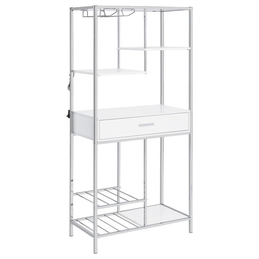 View full detailsEntertain in sleek sophistication with this modern home bar, featuring a curved silhouette, chrome accents, and glossy black and white acrylic pane...