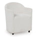Anchor your dining space with the quiet confidence of this dining arm chair. Its barrel design is wrapped in a boucle-like fabric in off-white, for a modern aesthetic that feels effortlessly refined. And for day-to-day function, the cleanable and stain-resistant upholstery offers an expertly crafted balance of luxury and livability. Smooth-gliding casters allow you to rearrange with ease.