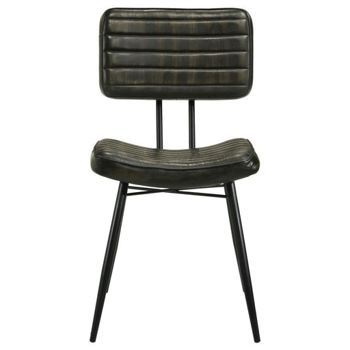 View full detailsBlending industrial edge with vintage charm, this dining side chair is a striking addition to any dining space. Upholstered in hand-dyed genuine go...