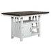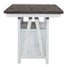 Weathered, rustic surfaces emphasize the simple beauty of everyday things. Farmhouse features a weathered white finish that looks better over time. A picnic style table generously styled to accommodate family and friends has two end leaves (18") that expand the table to 98". The classic Windsor chair known for its comfort, style, and value has simple turned legs and back spindles. Use the server in the dining room, foyer, or as a media console in the living room. This multi functional piece is 55" wide with 2 storage drawers and 2 open bottom shelves, one that accommodates wine storage. The open style server is accented with back diagonal slats to continue the farmhouse design. Add two of the leaning shelves on either side of the server to make a storage wall. The leaning shelves features 5 graduated shelves.