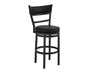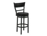 Upholstered Seat & Metal Frame Barstool. The Gray II collection stool features a modern, minimalist design perfect for contemporary spaces. Its sturdy metal frame has a sleek matte finish for durability. The round, cushioned seat is upholstered in black faux leather for comfort and easy maintenance. The gently curved backrest with horizontal metal accents offers ergonomic support, while a circular footrest adds stability, making it a versatile choice for kitchens, bars, or lounges.
