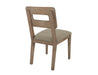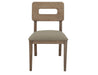 Upholstered Seat Wooden Chair. The Luma chair is a beautifully crafted wooden chair with a minimalist and modern design. It features a rectangular shape with a multi-step lacquer finish in a sand-brown, showcasing a seamless wood texture. The seat is upholstered in an ivory-colored fabric, providing both comfort and elegance.