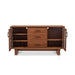 Meet the new crown jewel of your dining room. Our Lincoln buffet takes inspiration from influential architect Frank Lloyd Wright, to bring timeless style to the present. Elegance and utility come together in this piece with ample space to store everything you need for your next dinner party. Containing two storage cabinets with adjustable shelves and three drawers, the Lincoln buffet makes dining organization a breeze. Embellished with gleaming gunmetal hardware, the Lincoln is show-stopping from a distance, with details to make you look closer.