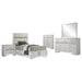 Glittering trim create a sense of sophistication for a modern bedroom set. Designed to make a statement, the set focuses on a bed that boasts a crisp, clean-lined silhouette that pairs a rectangular headboard with padded upholstery. Glittering diamond-like trim adorns the head and footboards of the bed and makes a statement on both the nightstand and dresser. Drawers are accentuated with jewelry inspired bar pulls that add to a gleaming presentation. Bracket feet complete the look of each piece in this set, offering a touch of timeless character and subtle movement.