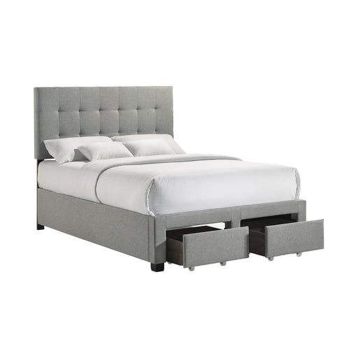 View full detailsThe Rhyan Upholstered Bed Collection features a Smoke Fabric covering anTufted Cushion, Arched Headboard with eye-catchingMatteChrome Nail Head Acc...