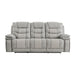 This beautiful proportioned quilted style will be a hit in any home. The padded envelope arms add a visual appeal. The power headrest and power recliner seem hidden but add to the comfort of this stylish reclining group. The quilted back and bucket chaise seating again add to the visual appeal without impacting the outstanding comfort. This group features a beautiful heavy weight leather and accent nail trim that will only grow in its beauty and appeal. When looking at this style from the front everything you see is genuine top grain leather. Construction is engineered plywood frame with padding completely on outside arms and back and metal seat box construction.