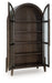 Embrace rustic sophistication with this impressive accent cabinet. Its rough-sawn textured exterior and deep dark brown finish exude warmth and character from top to bottom. Arched doors with glass inserts and oversized pulls open to reveal four shelves—two of them adjustable—giving you the freedom to organize your belongings exactly how you want.