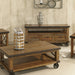 The Taos Living Collection is constructed from spruce veneers and select hardwoods and has a unique canyon brown finish. One TV stand and four accent tables are available to meet your exact living room needs. Wrought iron accents and caster wheels combined with a gentle brushed finish gives this set a warm yet industrial feel. Perfect for rooms that are looking for that little something extra!