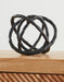 This sculpture brings contemporary art full circle. Interlocking metal rings in a black finish add an art gallery touch for a console table, bookshelf or mantel.